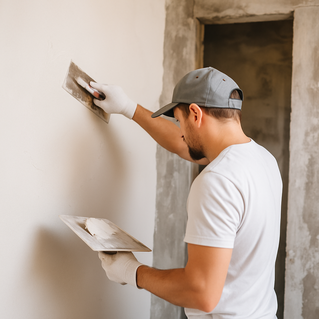 Application manuelle ou mécanique sur murs et plafonds pour obtenir des surfaces lisses, prêtes à peindre ou à décorer.